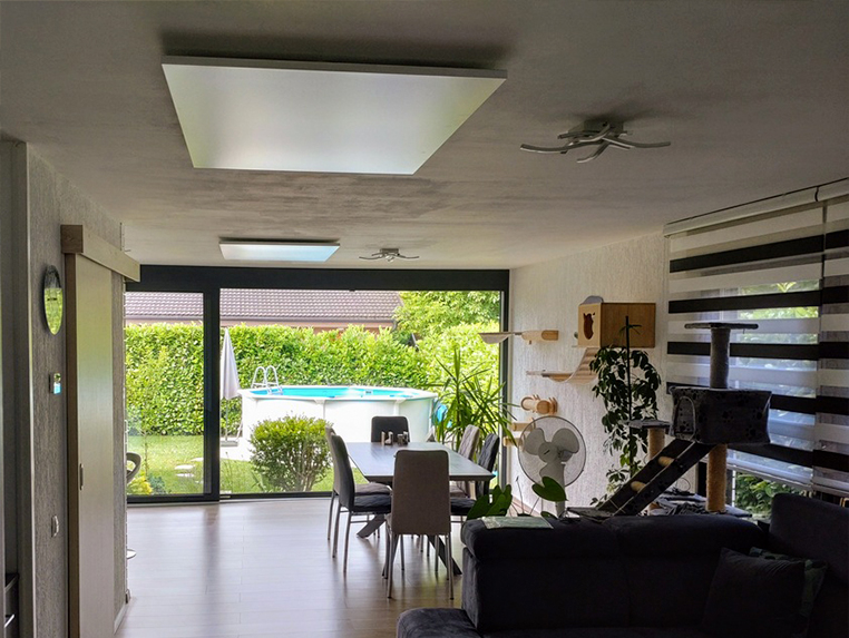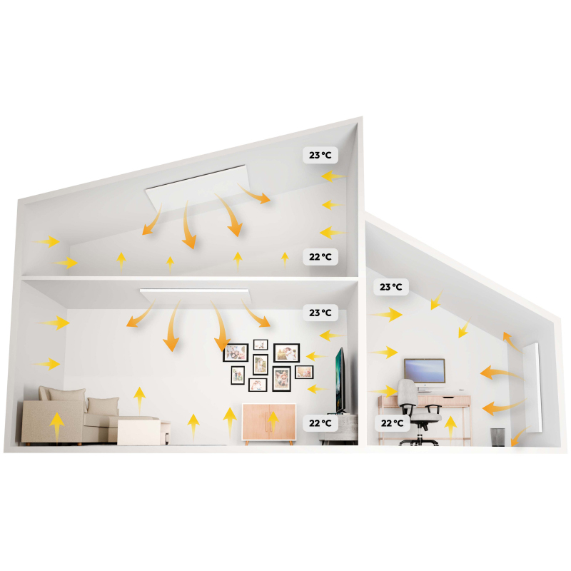 Kod montaže na strop, pod je također topliji, jer toplinsko zračenje izravno dopire do podnih površina. Budući da Ekosen IR paneli emitiraju toplinsko zračenje pod širokim kutom, ono se također akumulira u zidovima i drugim predmetima, pa se toplina vrlo ravnomjerno raspoređuje. Prostor djeluje kao niskotemperaturni radijator.
