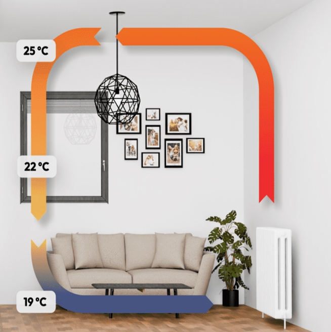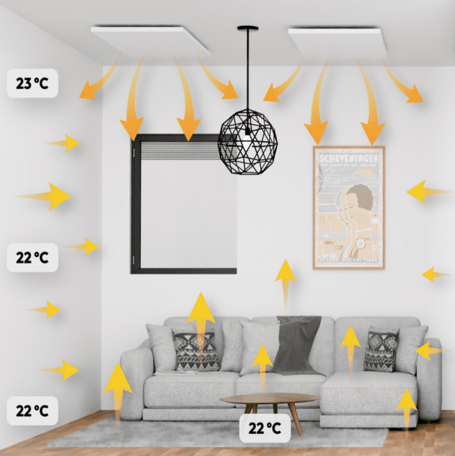 Ako imamo zadanu temperaturu, na primjer 22 °C, temperatura zraka bit će točno 22 °C i istovremeno će sve površine u prostoriji imati sličnu temperaturu. U praksi to znači da se cijeli prostor grije potpuno ravnomjerno bez hladnih zona.